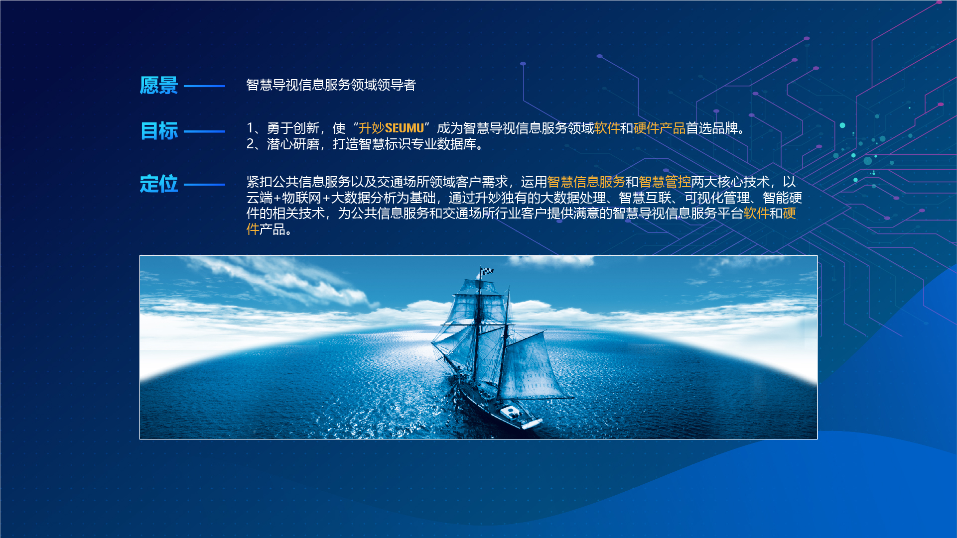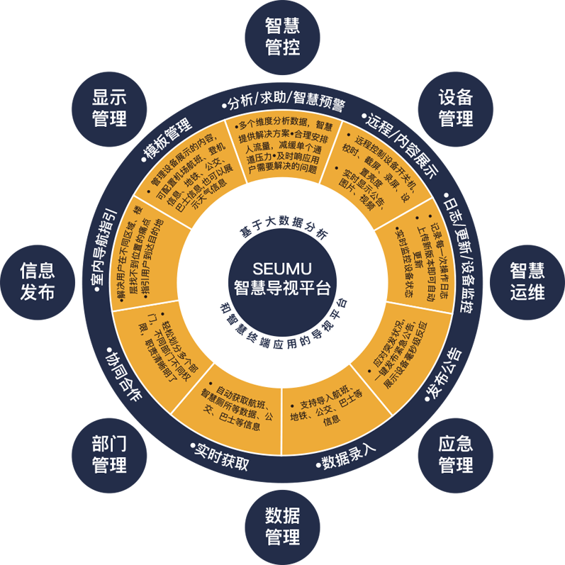 SEUMU(升妙)智慧导视平台是一款基于大数据的智慧导视信息服务平台软件,运用智慧信息服务和智慧管控两大核心技术,采用云端控制+智慧屏+智能控制器+数据采集与人机交互+智慧应用+室内导航+5G模式或WIFI6+可视化管理的全新模式的信息系统平台,与传统信息发布系统(动态标识系统、触摸查询)和灯箱标识有本质区别,升妙智慧平台基于大数据、物联网、云计算技术以及可视化管理以及人机交互应用,可以明显减少管理人工成本、提高服务水平,而且通过可视化应用,可以带来更好的用户体验,升妙智慧导视平台系统部署灵活、操作简单、数据提炼精确、安全性高、准确性强、融合性广、扩展便捷,可以非常好的满足公用场所和交通领域智慧化升级应用以及降低运营成本需求。